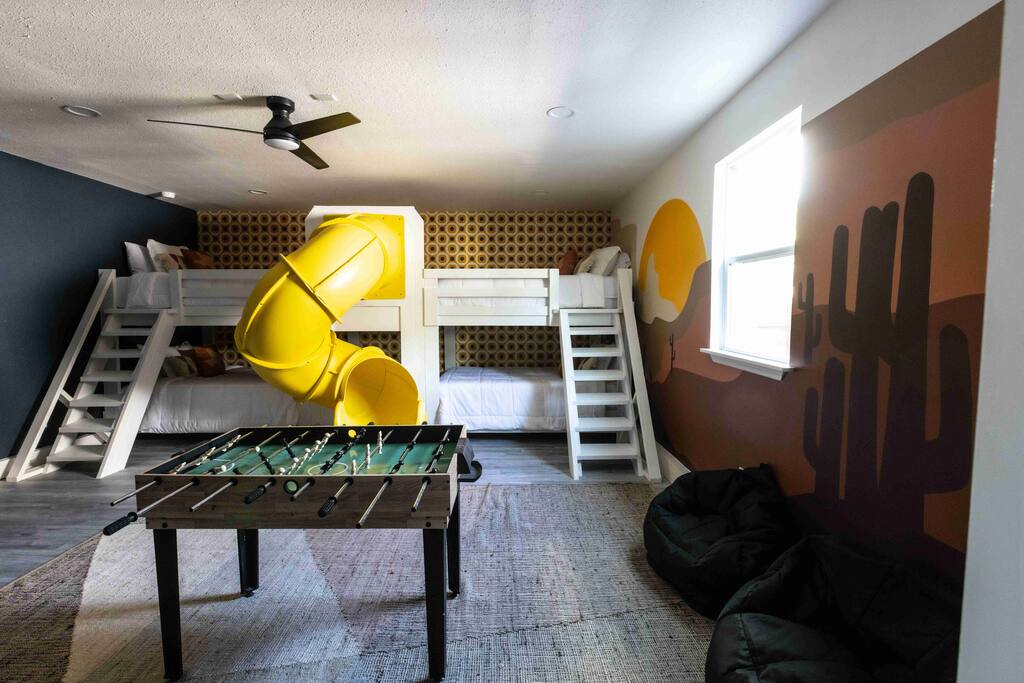 • Family Friendly! Fully Private House • Pool • Sport Court: Basketball/Pickleball • Fire Pit • BBQ • Corn hole • Mini Golf • BBQ Grill • Shuffleboard Table • Fully Stocked Kitchen • Kid Friendly! High Chair, Pack n Play, and Children's Dishes • TVs in Each Bedroom • Indoor Fireplace • Ample Parking • Dedicated Workspace • Smarthouse with Keypad entry, Nest Thermostat, high-speed WIFI, and Smart TV in EVERY room This gorgeous 4-bedroom, 2.5-bathroom plus playroom home is perfect for your next San Antonio getaway. Great for large families, group getaways, or special celebrations, this house can sleep up to 16 guests, making it the perfect place to make new memories. Hidden away in peaceful Castle Hills on a beautiful tree-lined street, this house offers easy access to all of San Antonio's top attractions without the hustle and bustle of downtown. Whether you're lounging by the pool, grilling with the family, or need a comfortable place to rest after a day of Six Flags roller coasters, this house has everything you need for your next Texas adventure. • 5 Minutes from Walmart, H-E-B, Whole Foods, and numerous chain and local restaurants. • 10-15 Minutes to San Antonio Airport, The Alamo, River Walk, Six Flags Fiesta Texas, and UTSA. Parking is available in the driveway, with ample additional free parking on the street. NO PARKING IN GARAGE. GARAGE DOOR DO NOT OPEN. The Space: BEDROOM 1 (Primary Bedroom): • King Bed • Twin Daybed • Ensuite Bathroom with His and Hers Sinks • Walk-in Closet • Smart TV • Ceiling Fan • Fullsize Mirror BEDROOM 2: • Queen Bed • Walk-in Closet • Smart TV • Ceiling Fan • Fullsize Mirror BEDROOM 3: • Queen Bed • Walk-in Closet • Smart TV • Ceiling Fan • Fullsize Mirror BEDROOM 4: • King Bed • Smart TV • Dedicated Workspace PLAYROOM (Lower Level through Laundry Room): • 2 Full/Full-sized Bunk Beds • Slide • Smart TV • Mini Foosball, Air Hockey, Pool • Boardgames • Children's Books BATHROOM 1: • Ensuite to Primary Bedroom • Shampoo, Conditioner, Bodywash • Towels •Tub • His and Hers Sinks • Extra Pillows and Linens BATHROOM 2: • Full Bath • Shampoo, Conditioner, Bodywash • Hairdryer • Towel • Tub BATHROOM 3 (Lower Level): • Half Bath CHEF’S KITCHEN: • Fully Stocked • High-end Appliances • Large Refrigerator • Ample Cabinetry • Children's Dishes and Cutlery • Island with Seating for 4 • Open Floor Plan to Breakfast Nook with Seating for 4 DINING ROOM: • Formal Dining Table with Seating for 6 • Shuffleboard • Coffee Station with Coffee Makers: French Press, Keurig, Coffee Pot, Hot Water Kettle, Syrups, Sugar, Tea • Open Floor Concept to Kitchen LIVING ROOM: • Smart TV • Large Leathered Sofa • Indoor Fireplace • Photo Wall with Custom LED Sign • Ample Seating SPECTACULAR RESORT-STYLE BACKYARD & POOL • Private Pool and Spa • Sportscourt: Basketball & Pickleball • Fire Pit • BBQ Grill • Putt Putt • Giant Connect 4 • Poolside Loungers Guest Access: Guests will have access to the entire home, yard, and pool. POOL LIABILITY: Please note that by booking this listing, you agree to take total and complete responsibility for the use of the pool and property. You understand that during the stay, there is no lifeguard on duty, and you shall be responsible for all guests and relatives using the pool. You understand that there are risks involved in the use of the pool facilities, such as injury or death and consent that the hosts are not liable. GRILL: Please clean THOROUGHLY after use. Gas canisters for BBQ and Fire Pit will be on the property but may need to be refilled. The local Walmart is less than 5 minutes away, and you can exchange tanks. We will reimburse the cost (~$20). PETS: DOGS ONLY allowed at an additional pet fee of $200 Per Pet for your entire stay. If bringing more than one pet, once booked, we will send you a request through the platform to cover the additional pet fee. You are responsible for any damages, so please only bring trained dogs, no puppies! You are responsible for bringing doggy bags and picking up all their waste.